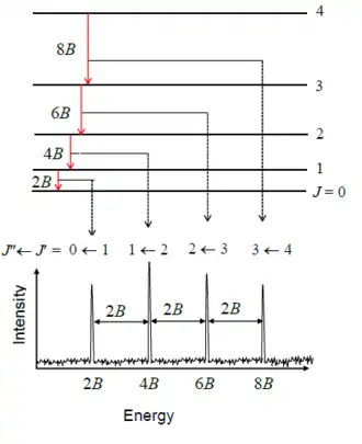 De afstand tussen de energieniveaus en bedraagt . Deze afstand neemt dus toe bij groter wordend kwantumgetal. De selectieregel voor overgangen met absorptie of emissie van een foton is ; bovendien moet het molecuul een permanent dipoolmoment hebben, hetgeen bij moleculen met twee gelijksoortige atomen niet het geval is. Daarom hebben deze moleculen geen rotatiespectrum.