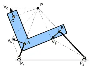 Voor het bepalen van de bewegingskarakteristieken van onderdeel BAC kan uitgegaan worden van punten A en B, daar de bewegingen van die punten nu bekend zijn van de informatie over de stangen P1A and P2B. De richting van beweging van punt A is aangegeven door vector VA. Het momentane draaipunt van A, als onderdeel van onderdeel BAC, moet liggen op een lijn loodrecht op de snelheidsvector VA van A. De enige lijn die daaraan voldoet is de lijn die in het verlengde ligt van stang P1A. Ergens op deze lijn ligt punt P, de momentane pool voor onderdeel BAC. Wat geldt voor punt A geldt ook voor punt B: de momentane pool ligt op een lijn loodrecht op vector VB, op de lijn in het verlengde van stang P2B. Waar de twee lijnen kruisen ligt het punt P.