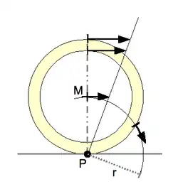 Alle punten op het wiel bewegen met eenzelfde, constante hoeksnelheid rond de momentane pool P. De richting van de beweging van een willekeurig punt is loodrecht op de poolstraal. De grootte van de snelheid van die punten is rechtevenredig met de poolstraal. In figuur 2 geven vectoren de richting aan waarin een aantal punten bewegen: het middelpunt M (i.e. de as) van het wiel, en punten bovenaan het wiel, aan de binnenkant van de velg, en aan de buitenkant. Alle punten op afstand 'r' van pool P, waaronder het middelpunt M, en dus ook het punt rechtsonder op de buitenkant van de velg, bewegen met dezelfde snelheid, echter in verschillende richtingen.