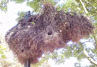 Deze kolonievogels nestelen in vrij grote groepen. Ze bouwen zeer grote vrijstaande nesten, die een diameter hebben van wel een meter. De binnenzijde van de nesten zijn bedekt met zachte grasstengels, het overige bouwwerk wordt gemaakt van takken. In een boom bevinden zich vaak meerdere nesten en elk nest wordt vaak door meerdere paartjes bewoond. Elk paartje heeft in zo'n nest zijn eigen kraamkamer. Ook buiten de broedtijd worden de nesten door de vogels bewoond.
