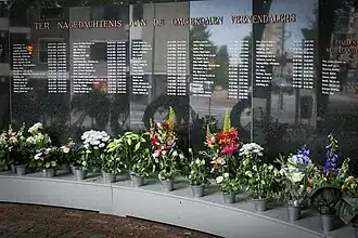 De gedenksteen achter het standbeeld bevat alle namen van de gevallenen uit de Tweede Wereldoorlog voor wie dit monument is opgericht onder de tekst “TER NAGEDACHTENIS AAN DE OMGEKOMEN VEENENDALERS”. Op de linkerkant van de steen staat “DE KINDEREN DIE IN EN DOOR DE TWEEDE WERELDOORLOG HET LEVEN LIETEN”. Op de rechterkant staat “GEVALLEN IN NEDERLANDS – INDIË”, met daaronder de negen namen van de mensen die omkwamen bij de Politionele Acties.