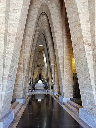 Het is 53 m hoog te rekenen vanaf het bovenste terras en 68 hoog vanaf de oever. Het heeft de vorm van een zeil. Vanuit de lucht bekeken heeft het de vorm van een vogel, waarbij de twee zijmuren van het memoriaal de vleugels zijn van de vogel. In de top van het monument is er een uitkijkplatform met een Mariabeeld.
