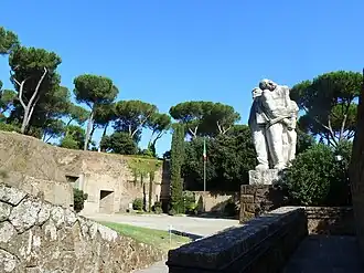 Op het voorplein staat een zes meter hoog travertijnen beeld, een werk van Francesco Coccia, genaamd Le tre età ("de drie leeftijden"). Het staat symbool voor de slachtoffers en stelt drie mannen voor van verschillende leeftijden: jeugd, volwassenheid en ouderdom, met de handen op de rug gebonden zoals de slachtoffers naar hun dood waren gevoerd.