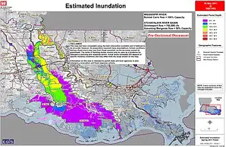 De constructie van de Spillway werd in 1954 voltooid en het bouwwerk werd in de 20e eeuw slechts eenmaal, in 1973, gebruikt. Met vele stuwen kan men tot 17.000 m³/s water van de Mississippi afvoeren. Op 13 mei 2011 werd beslist de stuwen voor een tweede maal sinds de ingebruikname te openen om de sterk gezwollen Mississippi te ontlasten. Deze beslissing wordt meestal slechts genomen wanneer het debiet van de stroom boven de 42.000 m³/s is gestegen. Op basis van overstromingssimulaties koos men er in 2011 voor de stuwen voor 25% van hun maximale capaciteit te openen.