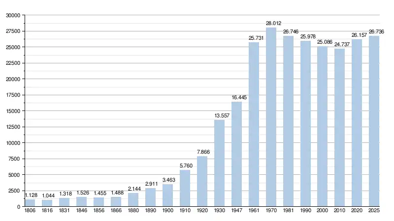 - Bronnen:NIS, Opm:1806 tot en met 1981=volkstellingen; 1990 en later= inwonertal op 1 januari