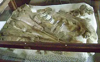 - ↑ Martin J.E, & P.R. Bjork, 1987, "Gastric residues associated with a mosasaur from the late Cretaceous (Campanian) Pierre Shale in South Dakota", Dakoterra 3: 68-72