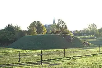 Op de heuvel zijn resten van mortel en baksteen gevonden die erop wijzen dat er een gebouw, mogelijk een donjon, heeft gestaan.