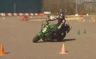 - witte lijn tussen twee gele kegels: jinx, het voorwiel van de motor moet over die lijn en terug