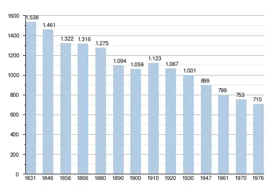 - Bronnen:NIS, Opm:1831 tot en met 1970=volkstellingen, 1976= inwoneraantal op 31 december