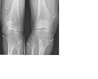 - ↑ (en) Darilek S, Wicklund C, Novy D, Scott A, Gambello M, Johnston D, Hecht J (May 2005). Hereditary multiple exostosis and pain. Journal of Pediatric Orthopedy 25 (3): 369–76. PMID 15832158. DOI: 10.1097/01.bpo.0000150813.18673.ad.