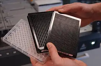 Een microtiterplaat of microplaat is een recipiënt met meerdere kleine ruimten waarin reagentia kunnen worden gemengd of bewaard.[1] Een standaardformaat bevat 96 welletjes (8 rijen bij 12 kolommen), maar er bestaan ook platen met bijvoorbeeld 384 welletjes. Microtiterplaten worden veel gebruikt in laboratoriumonderzoek. Ze worden veelal vervaardigd van polystyreen.