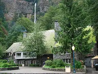 Bij het parkeerterrein en aan de voet van de waterval staat een lodge. In 1915 was de weg langs de rivier geopend en dit maakte de waterval goed bereikbaar. De lodge werd gebouwd in opdracht van het stadsbestuur van Portland om het toerisme te bevorderen.[1] Architect A.E. Doyle tekende het ontwerp en de Waale-Shattuck Company nam het werk aan voor $ 40.000.[1] De lodge werd in 1925 geopend en is in 1982 opgenomen in het National Register of Historic Places. In de lodge zijn een souvenirwinkel, een restaurant en een snackbar gevestigd.