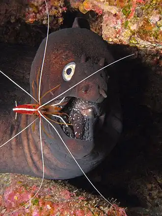 | Muraena augusti met een atlantische poetsgarnaal (Lysmata grabhami) | |||||||||||||||