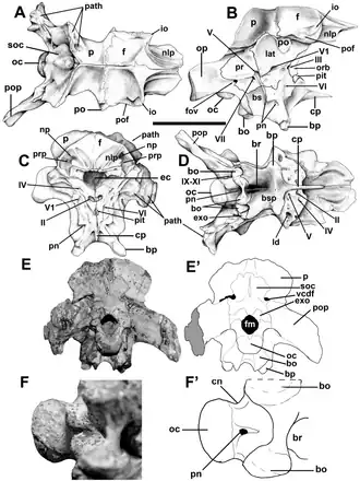 Daarnaast is er een unieke combinatie van op zich niet unieke kenmerken. In de hersenpan zijn de processus basipterygoidei aan de voorste onderkant van het basisfenoïde gelegen terwijl de doorgang van de recessus basisphenoideus naar boven en achteren gericht is. Het basisfenoïde heeft een ondiepe brede inkeping tussen de tubera basilaria en de processus basipterygoidei. De chevrons zijn nogal recht.