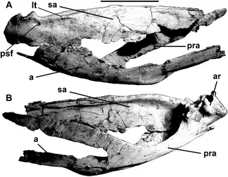 De bewaard gebleven achterkant van de rechteronderkaak is nogal hoog en omvangrijk. Tegelijkertijd zijn de elementen ervan lichtgebouwd en langgerekt. De grote hoogte diende kennelijk dus niet simpelweg om de bijtkracht verhogen door een zware musculatuur. Een alternatieve verklaring is dat de kaak ermee sneller dichtgeklapt kon worden. Dat sluit aan bij de gedachte dat de kaak als geheel tamelijk lang was. De beschrijvers schatten de oorspronkelijke lengte op zeventig centimeter. Zo'n lange kaak heeft vooraan weinig bijtkracht maar kan wel gebruikt worden om een kleine snelle prooi te grijpen, bijvoorbeeld een kleine tweevoetige euornithopode.