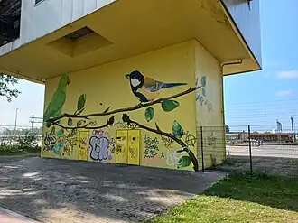 De kunstenaars voorzagen het zuidelijk bedieningshuis met een tak waarop twee vogels elkaar aankijken; een daarvan is een halsbandparkiet, een exoot die goed gedijt in Amsterdam. Deze schildering werd in juli 2019 gezet.[1]