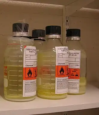 Hoewel n-BuLi in zuivere vorm een kleurloze vloeistof is, wordt het meestal aangetroffen als een lichtgele oplossing in alkanen. Dergelijke oplossingen zijn bijna oneindig houdbaar, mits op de juiste manier opgeslagen.[1] In de praktijk moet geconstateerd worden dat een langzame ontleding optreedt. Er ontstaat een fijn wit neerslag van lithiumhydride en de kleur verandert langzaam via geel naar oranje.