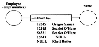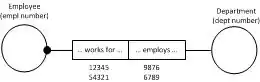 Hieronder in figuur 1 wordt een conceptueel schema getoond. Dit diagram bestaat uit een binair feittype bestaande uit 2 rollen, de linkerrol gespeeld door het entiteittype employee, de rechterrol gespeeld door het labeltype name.