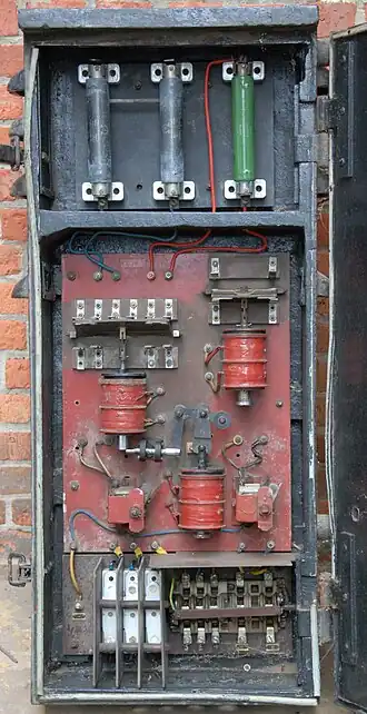 In het midden links het hoofdrelais met onderaan het grendelmechanisme en de ontgrendelspoel.