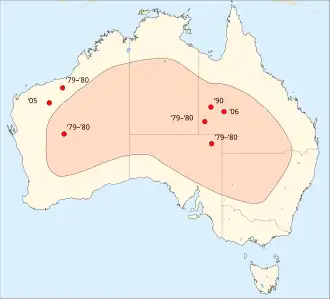 | Verspreidingsgebied van de nachtpapegaai. Rode stippen geven de laatste waarnemingen weer tussen 1979 en 2006. | |||||||||||||