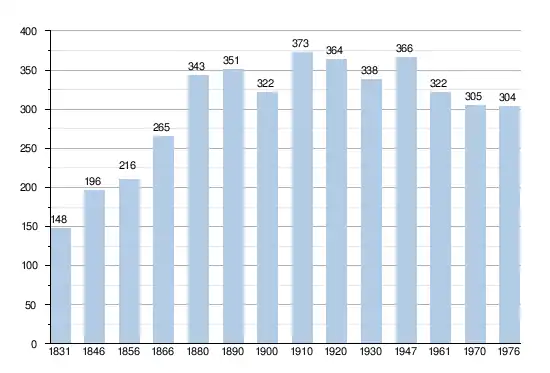 - Bronnen:NIS, Opm:1831 tot en met 1970=volkstellingen, 1976= inwoneraantal op 31 december