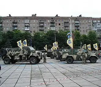 Tijdens de aanhoudende oorlog in de Donbas -regio van Oekraïne hebben de troepen van de nieuw leven ingeblazen Nationale Garde gevochten tegen pro-Russische separatisten en Russische troepen vermomd als separatisten. Bij gebrek aan reserves hebben eerder in het conflict bereidwillige burgers en politieke groeperingen hun eigen milities en paramilitaire groepen opgericht, bekend als de " vrijwilligersbataljons ", om de separatisten alleen te bestrijden. [15] De bataljons zouden de lijn tegen de separatisten hebben vastgehouden en de Nationale Garde en de strijdkrachten hebben toegestaan zich te reorganiseren en terug te slaan. Sommige bataljons stonden onder auspiciën van het Ministerie van Binnenlandse Zaken [15] Twee daarvan waren de bataljons Azov en Donbass, veruit de grootste vrijwilligerseenheden met een sterkte van 1.000 en 900 soldaten. Vanwege de omvang en het operationele succes van die bataljons werden ze overgeplaatst om onder het bevel van de Nationale Garde te komen. [16][17][18][19]