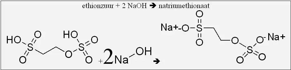 Eerst worden twee natriumhydroxide moleculen aan het ethionzuur toegevoegd, hetgeen leidt tot natriumethionaat.