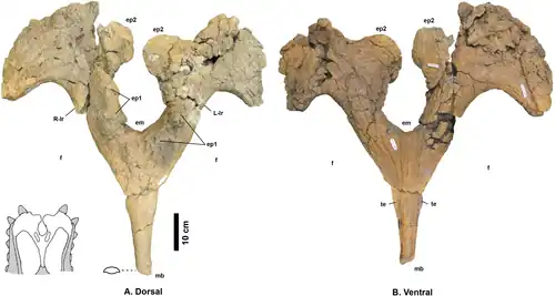 De wandbeenderen hebben diepe adergroeven, vooral aan de onderzijde. De pariëtaalvensters zijn groot en hoekig. De middenbalk heeft een lensvormige dwarsdoorsnede. De middenbalk en de zijtakken van de achterbalk hebben samen een Y-vorm, in het midden ingekeept door een grote ovale inham die 132 millimeter naar voren steekt. De zijtakken vormen samen een M waarvan de gebogen punten tussen de tweede en derde epiparietalia liggen. De zijtakken versmallen eerst naar buiten toe met een breedte van voor naar achter van rond de twaalf centimeter dicht bij de middenbalk tot ruim negen centimeter halverwege de punten alwaar ze weer verdikken tot twintig centimeter. Uiteindelijk versmallen ze weer richting squamosa.