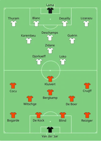 Nederland en Frankrijk kwamen in 120 minuten niet tot scoren. In de strafschoppenreeks trok Frankrijk aan het langste eind. Clarence Seedorf miste als enige zijn strafschop.[8] Na afloop werd de Franse verdediger Laurent Blanc verkozen tot man van de wedstrijd.