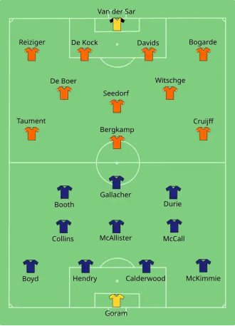 Net als op het EK 1992 mocht Nederland het in zijn eerste groepswedstrijd opnemen tegen Schotland. Bondscoach Guus Hiddink koos voor een 4-3-3-formatie, maar kon in de verdediging niet op zijn gebruikelijke centrumverdedigers (Frank de Boer en Danny Blind) rekenen. De Boer miste het EK door een enkelblessure, terwijl aanvoerder Blind een schorsing uitzat. Daardoor moest Hiddink op zoek naar een nieuwe voorstopper en een nieuwe centrale verdediger die voor de opbouw van achteruit kon zorgen. De bondscoach koos uiteindelijk voor het duo De Kock-Davids.[1] In de spits koos Hiddink voor Dennis Bergkamp, die op de flanken steun kreeg van Gaston Taument en Jordi Cruijff. Ronald de Boer, die twee jaar eerder nog als diepe spits werd gebruikt, vormde op het EK samen met Clarence Seedorf en Richard Witschge het middenveld van Oranje.