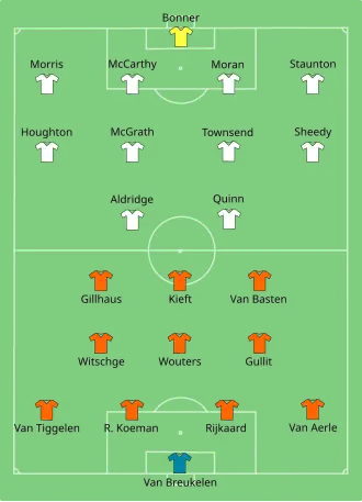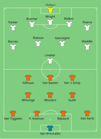 Tegen West-Duitsland haalde Frank Rijkaard in de 23ste minuut Rudi Völler onderuit, wat hem geel kostte en een schorsing. Völler gaf commentaar en kreeg ook geel. Völler moest later met zijn tweede geel van het veld af toen hij over Van Breukelen sprong. Rijkaard bespuugde Völler, waarop hij ook rood kreeg.