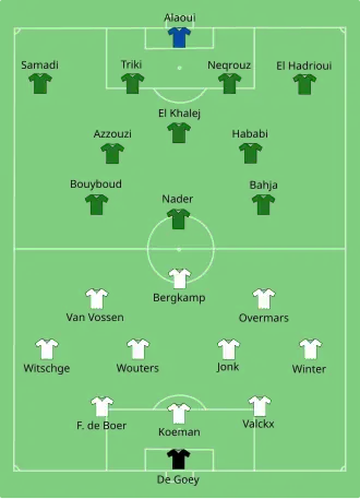 In de derde groepswedstrijd moest Oranje het opnemen tegen Marokko. Advocaat koos net als in de tweede helft tegen België voor een 3-4-3-systeem. Rechts op het middenveld maakte Frank Rijkaard plaats voor Aron Winter.[6] In de aanval keerde Overmars terug en werd linksbuiten Bryan Roy vervangen door Peter van Vossen. Witschge behield zijn positie als linkermiddenvelder. Nederland won het duel met 2-1 en werd dankzij de verrassende nederlaag van België tegen Saoedi-Arabië onverhoopt groepswinnaar.