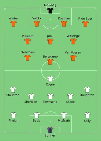 In de aanloop naar het duel tegen Ierland experimenteerde Advocaat tijdens een trainingssessie met een 4-4-2-formatie, maar toen dat experiment mislukte - het A-team verloor met 0-3 van een B-team dat bestond uit onder meer fysiotherapeut Rob Ouderland en reservedoelman Edwin van der Sar als libero - koos Advocaat voor een 4-3-3-formatie.[7] De bondscoach greep terug naar vier verdedigers omdat aanvoerder Ronald Koeman en linksachter Frank de Boer zich niet in hun sas voelden in een driekoppige defensie.[6][8] Door het veranderen van de tactiek belandde Winter op de positie van rechtsachter en keerde Rijkaard terug in het elftal in de plaats van de geschorste Wouters. Oranje won het duel tegen de Ieren met 2-0 dankzij doelpunten van Bergkamp en Wim Jonk.