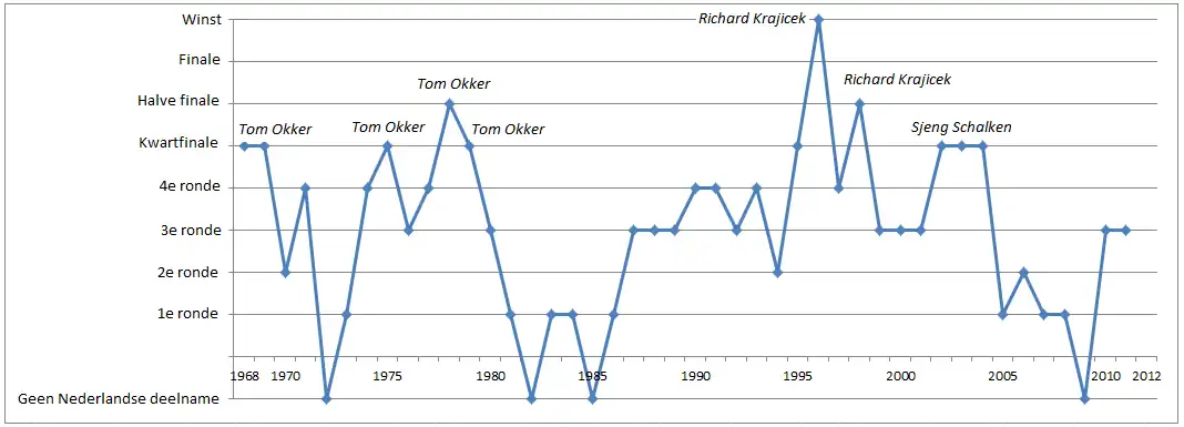 De grafiek hieronder laat zien in welke ronde de best presterende Nederlander van dat jaar werd uitgeschakeld.