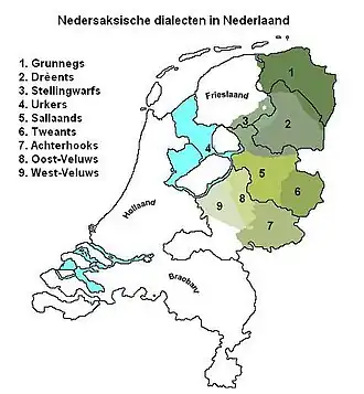 | Gesproken in | Nederland en Duitsland: Nederland: Nederlands-Nedersaksisch in Overijssel, Drenthe, Groningen en delen van Gelderland, Utrecht en Friesland. Ook op Urk (provincie Flevoland). | |||