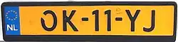 Deze kentekenplaat is geel, met een zwart kader en een blauw vlak met het EU-symbool en het NL-teken.