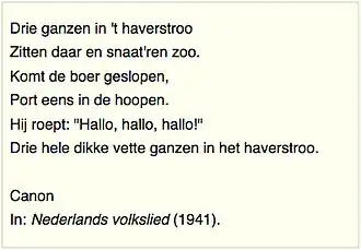 - ↑ a b Alle liedjes in dit artikel worden aangeduid met het incipit (de beginregel) - en dus niet met de titel. Dit is gebruikelijk in het historische liedonderzoek om drie redenen. Ten eerste: liedjes uit de orale traditie hebben geen vaste titel; de titel kan hierdoor in elk liedboekje verschillen. Ten tweede: veel titels zijn niet onderscheidend: er zijn vele liedjes met titels als Meilied, Het vogeltje, Avondliedje, Herfstliedje of Een nieuw sinterklaaslied. En ten derde maakt de titel geen onderdeel uit van het lied; het incipit identificeert het lied, voor iedereen die het kent, met inbegrip van de melodie. Bijvoorbeeld: de titel Een oud kerstliedeken is willekeurig èn niet onderscheidend; het incipit De herdertjes lagen bij nachte identificeert één specifiek lied.