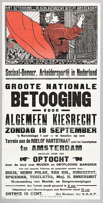 Door het censuskiesrecht had begin negentiende eeuw slechts een beperkte groep burgers de mogelijkheid om hun bestuurders te kiezen. Eind jaren zeventig van de negentiende eeuw ijverden de liberalen voor algemeen kiesrecht. Zo werden diverse voorstellen gedaan tot verlaging van de drempel om kiesrecht te krijgen.[2] Vanaf het begin van de jaren tachtig werd het vooral een aangelegenheid van de arbeidersbeweging.