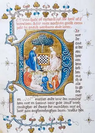 Het schaken stond symbool voor galante interactie tussen geliefden en dat kwam tevens tot uitdrukking in de literatuur, waar het schaken de liefde verbeeldde: Het oudst bekende voorbeeld hiervan is een miniatuur uit een handschrift van de Tafel van den kersten ghelove van Dirc van Delf uit 1404.[14][15]