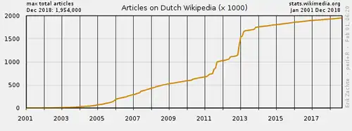 Op 27 januari 2005 verscheen het 50.000e artikel (Pianosa),[5][6] en op 14 oktober van datzelfde jaar werd de mijlpaal van 100.000 artikelen bereikt.[7] Op 17 december 2011 verscheen het één miljoenste artikel op de Nederlandstalige Wikipedia. Vanaf de start van de Nederlandstalige editie steeg het aantal artikelen geleidelijk. Vanaf maart 2006 groeide de encyclopedie plotseling sterk, met een piek van 1.000 nieuwe artikelen per dag in mei 2006 door de inzet van een bot die in zes weken tijd 35.000 artikelen over gemeenten in Frankrijk toevoegde. Hierna nam de dagelijkse groei sterk af tot een gemiddelde van ongeveer 250 nieuwe artikelen per dag.[8]