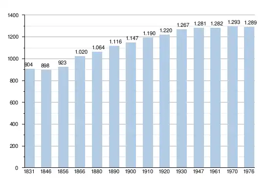 - Bronnen:NIS, Opm:1831 tot en met 1970=volkstellingen; 1976 = inwoneraantal op 31 december