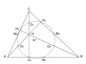 - Het middelpunt N van de negenpuntscirkel ligt op de rechte van Euler en de cirkel van Lester. Het is het driehoekscentrum met kimberlingnummer X(5). De barycentrische coördinaten van N zijn