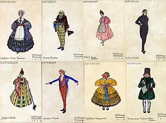 Van het stuk Notabelen[21] (1915) is niet allleen de (zwartwit)foto van de acteurs in het decor bewaard gebleven maar ook de oorspronkelijk ontwerptekeningen in kleur van Nell (getekend door Frits).