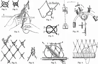 - Traditioneel worden netten gemaakt door gedraaide of gevlochten garens op hun kruispunten te knopen. Hiervoor kan een boetnaald of een netknoopmachine worden gebruikt.[3] Soms worden de randen van een net versterkt met een randlijn.
