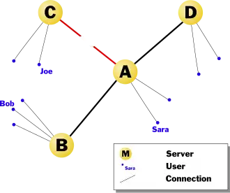 Elke lijn staat voor een verbinding tussen twee nodes, een node representeert of een server of een gebruiker op het netwerk. Server C is direct verbonden met A, die verbonden is met B en D.