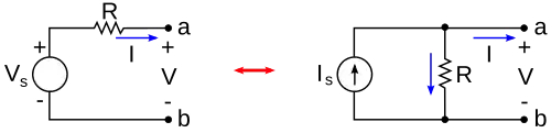 Een bron met een inwendige impedantie, dat wil zeggen een niet-ideale bron, kan worden voorgesteld als ideale spanningsbron of een ideale stroombron, met de inwendige impedantie. Deze twee vormen zijn equivalent, en onderstaand worden de transformatie weergegeven. Als de twee netwerken equivalent zijn ten opzichte van de aansluitingen , dan moeten en voor beide netwerken identiek zijn. Derhalve: