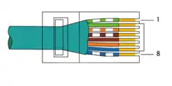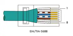 Op een RJ-45-connector worden de kleuren afgewerkt conform de T568B (EIA/TIA-568)-standaard.