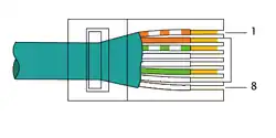 Onderstaande afbeeldingen gelden voor standaardkabels, T568B. Voor T568A moeten de kleuren op pen 1 en 2 verwisseld worden met 3 en 6.