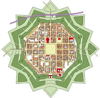 De rechte straten van Neuf-Brisach, op de achtergrond de Église Royale Saint-Louis