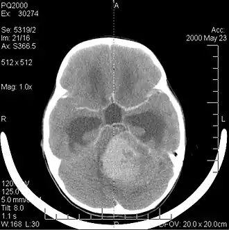 Computertomografie van de hersenen toont typisch een weefselmassa die door beide contrasten kan worden versterkt. Op CT lijken laaggradige gliomen gewoonlijk isodense aan het normale parenchym en vertonen daarom mogelijk geen contrastversterking. Evenzo zijn laesies in de achterste schedelgroeve moeilijk te identificeren op CT. Bijgevolg zijn de resultaten van een dergelijke tomografie alleen niet altijd voldoende voor diagnostische doeleinden. In twijfelgevallen is het gebruik van de meer gevoelige magnetische resonantiebeeldvorming essentieel.